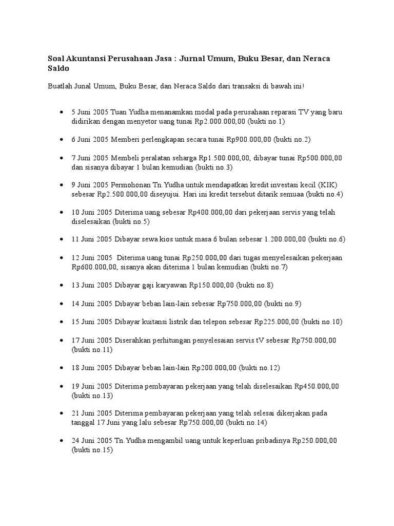 Download Soal Soal Akuntansi Perusahaan Jasa Dan Jawabannya PDF 1500 MB - SamPDF SamPDF Contoh Soal Akuntansi Perusahaan Jasa beserta Pembahasannya Jurnal Umum part 1 Latihan Soal Pembuatan Jurnal Penyesuaian Perusahaan Jasa dan Pembahasannya. SOAL DAN JAWABAN YAC SMA SIKLUS AKUNTANSI PERUSAHAAN JASA. Latar BelakangLatar belakang disusunnya makalah ini adalah untuk memenuhi tugas yang di berikan oleh Dosen dalam rangka membahas tentang Perusahaan Dagang makalah ini membahas tentang Pengertian perusahaan dagang karakteristik perusahaan dagang siklus berjalannya perusahaan dagang dan bagaimana menulis transaksitransaksi yang terjadi di perusahaan dagangBila di kaitkan dengan.