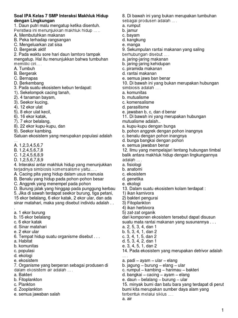 Pilihlah jawaban yang benar 1. Pencemaran lingkungan Other contents. Soal interaksi makhluk hidup kelas 7 7 Soal dan Jawaban IPA Interaksi Makhluk Hidup dengan Lingkungan.