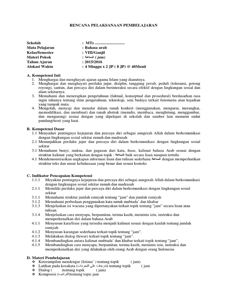 Download Rpp Bahasa Arab Kelas 8 Mts Kurikulum 2013 K13